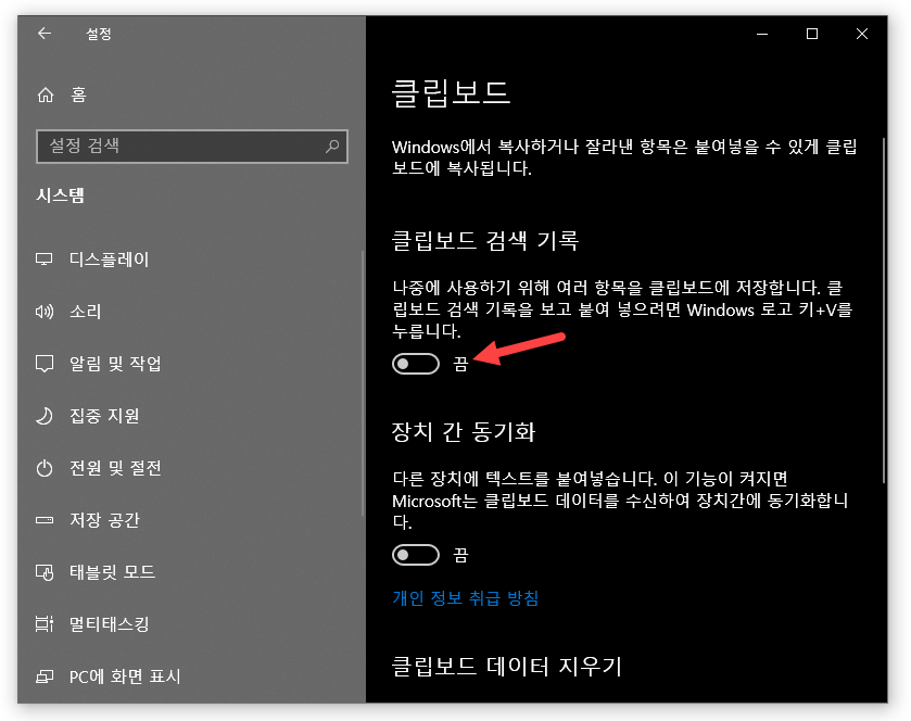 생각해보니 자주 사용하지 않는데도 테스트할 겸 켜놓았던 윈도우 10의 클라우드 클립보드 동기화 기능이 생각났습니다. 이걸 꺼보면 어떨까 하는 생각이 들더군요. 시험해본 결과는 만족스러웠습니다. 복사/붙여넣기의 속도가 많이 개선되더군요.