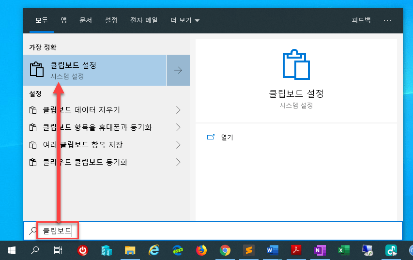 윈도우 키를 눌러 '클립보드'를 입력합니다. [클립보드 설정]에 들어가세요.