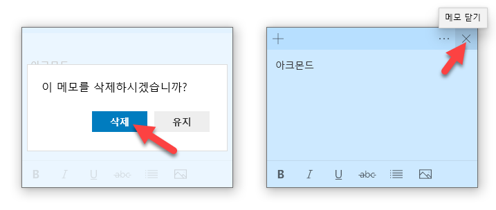 ▲[삭제]를 누르면 깨끗하게 삭제됩니다. 화면에 띄워두지 않을 목적이라면, 굳이 삭제할 필요 없이, '메모 닫기'를 누르면 됩니다.