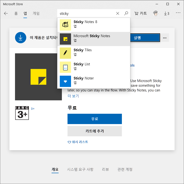 ▲검색해도 나오지 않는다면 윈도우 스토어에서 내려받아 설치하면 됩니다. 'sticky'로 검색해보세요.