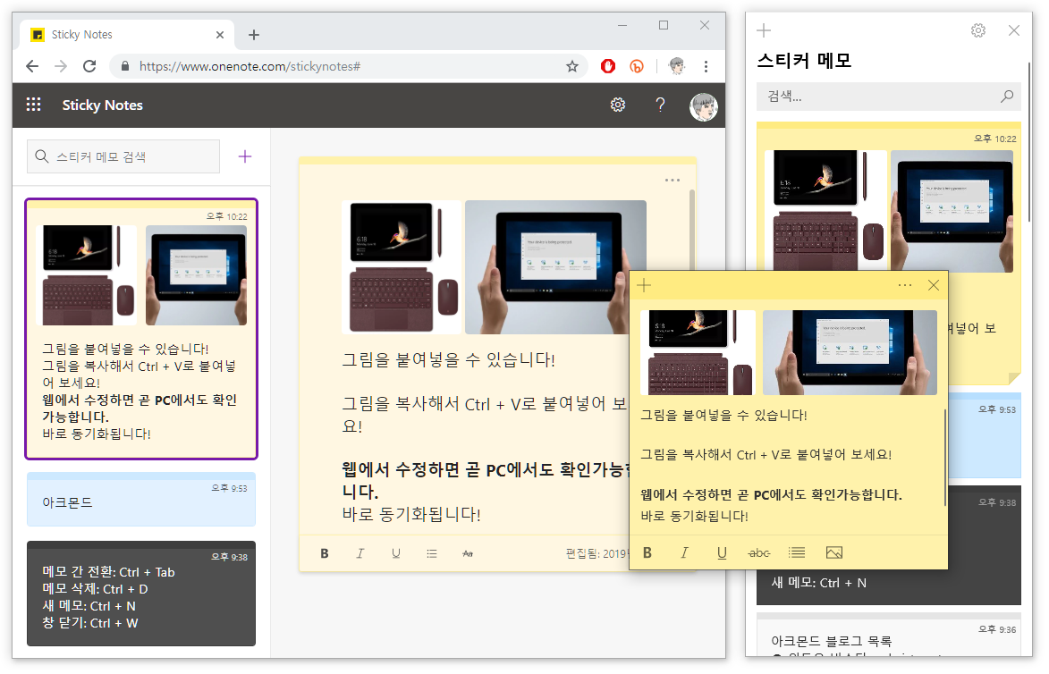 ▲마치 윈도우 10에서 사용하는 것처럼 스티커 노트를 활용할 수 있습니다.