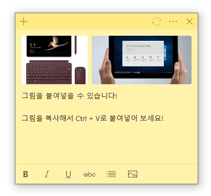▲이미지도 넣을 수 있습니다. 그림을 복사하거나, 이미지 추가 버튼을 클릭해서 메모에 넣어보세요.