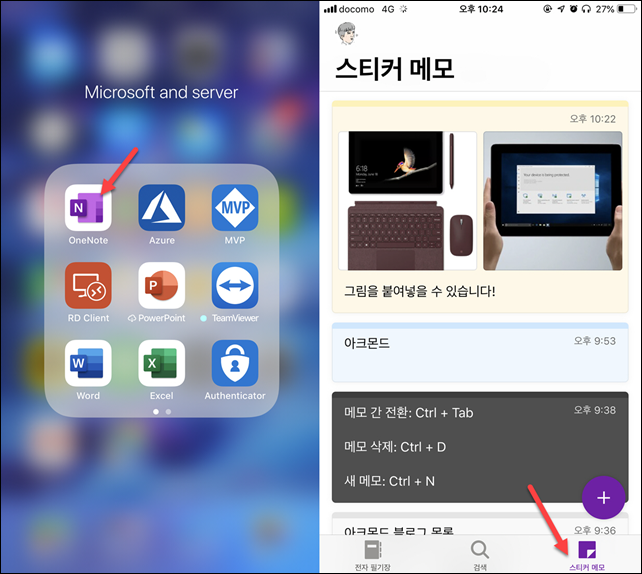 스마트폰에서는 원노트(OneNote)를 다운로드하면 됩니다.(원노트에 스티커 메모가 있어요!)